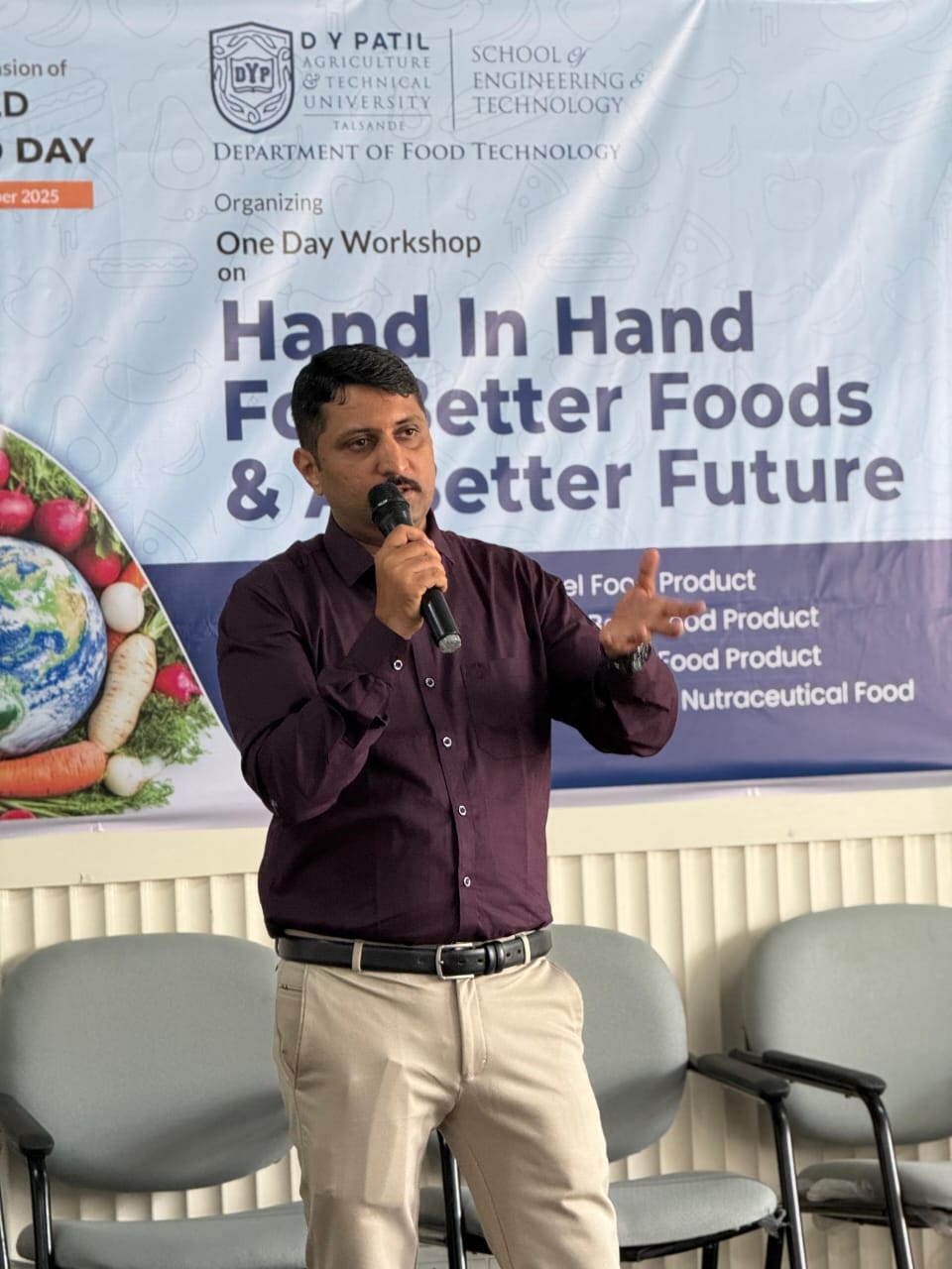 डॉ. पाटील यांनी यावेळी बोलताना, अन्न पदार्थांची गुणवत्ता वाढविण्यासोबतच कौशल्यवृद्धीवर विशेष भर देणे आवश्यक आहे, असे मत व्यक्त केले. पौष्टिक आणि गुणवत्तापूर्ण अन्न उत्पादनासाठी तरुण उद्योजकांनी पुढे यावे, असे आवाहनही त्यांनी केले. या वर्षीच्या ‘जागतिक अन्न दिनाचा’ विषय “हॅन्ड इन हॅन्ड फॉर बेटर फूड अँड बेटर फु्चर” हा होता.