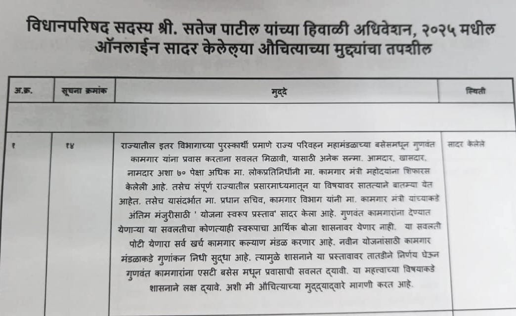 महाराष्ट्र शासनाच्या कामगार विभागाच्यावतीने गुणवंत कामगारांना राज्यातील इतर विभागाच्या पुरस्कार्थीप्रमाणे महाराष्ट्र राज्य परिवहन महामंडळाच्या बस प्रवासात सवलत देण्यात यावी, यासाठी चालू हिवाळी अधिवेशनात आमदार सतेज ऊर्फ बंटी पाटील यांनी औचित्याचा मुद्दा दाखल केला आहे.अशाप्रकारे प्रवास करताना सवलत मिळावी, राज्यातील आमदार, खासदार, नामदार अशा ७० पेक्षा अधिक लोकप्रतिनिधींनी मा. कामगार मंत्री आकाश फुंडकर यांचेकडे शिफारस केलेली आहे.